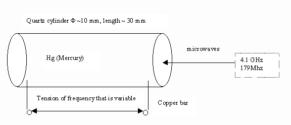 The calculation of the amount of energy generated is obtained from the energy released from the nuclear spin magnetic moment for I = 3/2 to Hg201= (3.685371) ~ 3.68 MeV (13.2% natural abundance) (Hg199) (3.32789) ~3.33MeV and I = 1/2 (16.8% natural abundance). We obtain that E = N· (3.68MeV·0.132 +3.33MeV·0.168) · 1.602·10-19 C => E = 5.091·1011 J (where N is the number of atoms in a 1 kg of Hg). With Avogadro’s number, 6.022·1023 atoms are contained in a mass of 200.59 g with a density of 13600 Kg/m3, and 3.0022·1024 atoms in a 1 Kg of Hg; the mass is m=0.0024·mn of the neutron mass very close to mass defect. Because this frequency is in UV we must realize a quartz cylinder filled with mercury like this (dimensions in millimeters):